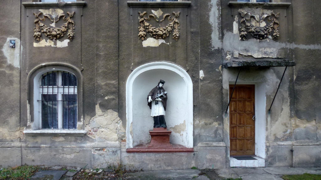 ustawiono drewnianą, barokową figurę św. Jana Nepomucena